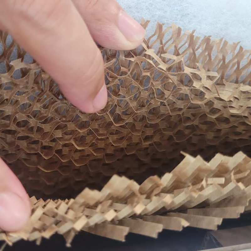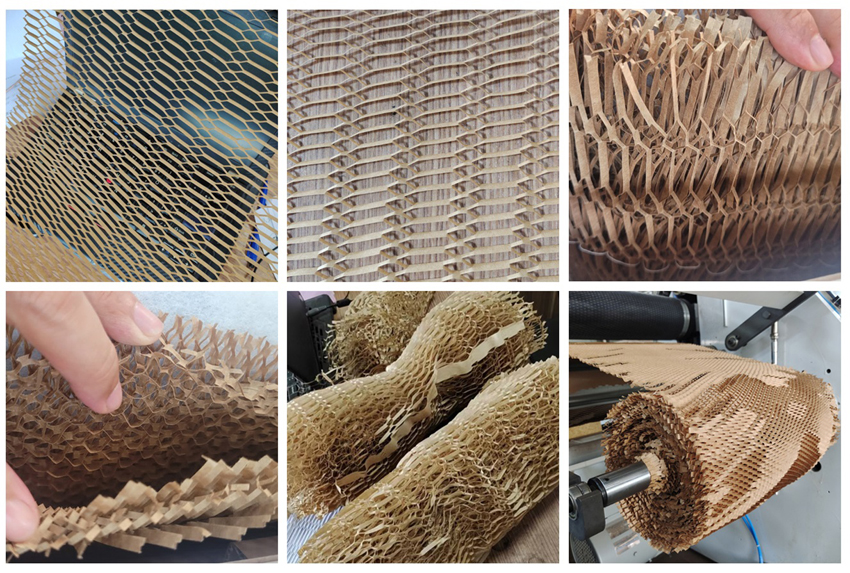 Also our normal honeycomb paper forming machine can make simple honeycomb shape kraft paper without the pulling cutting paper and directly rewind the finished paper to air shaft.So this mean the same machine can do both job,one function is making the honeycomb type paper,mesh paper for packing field using,another function is making the flame resistant paper to be used as filter material in workshop.But when make the filter paper,the machine we will design some longer between the die cutting module and the rewinding device,then customer can add some stitching or sewing machine in this making process.